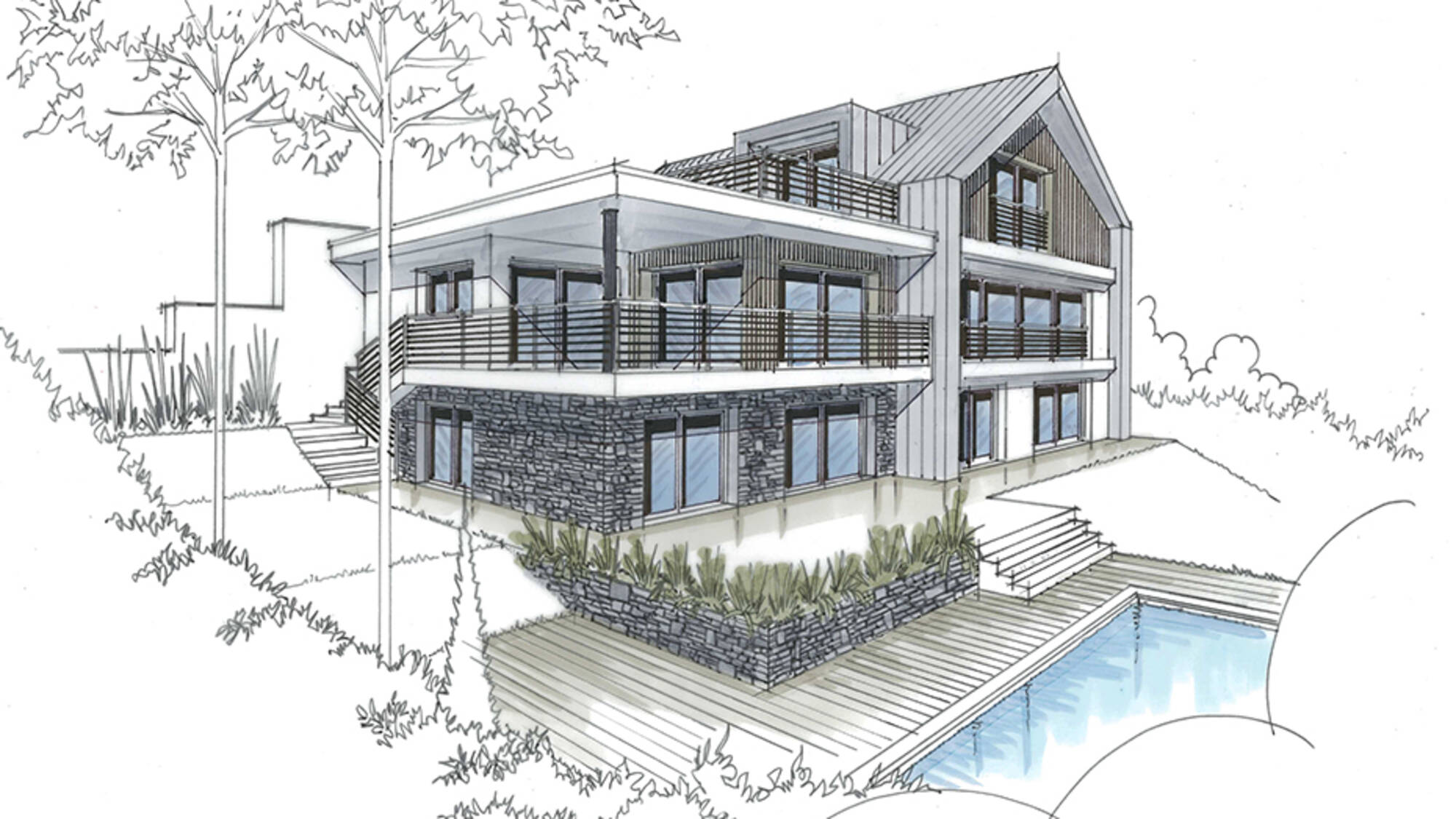 Maison alliant avec harmonie plusieurs matériaux nobles : le bois, la pierre et le zinc pour une architecture contemporaine et audacieuse.